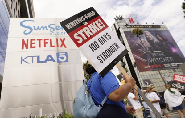 纽约(美联社)——在编剧罢工的第100天,Shawn Batey在八月的太阳下满头大汗,在Netflix纽约办公室外的警戒线上举着她的“IATSE团结”的牌子,但她很高兴能在那里。