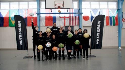 足球蕨Kate Taylor和银蕨Grace Nweke互相教授对方和埃文代尔中学的学生各自的运动。