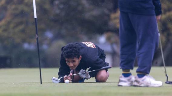 在Zespri AIMS比赛九洞高尔夫球锦标赛中,贝利·蒂帕-塔劳正在评估他在芒格努伊山高尔夫俱乐部的选择。图片来源:Jamie Troughton/AIMS Games