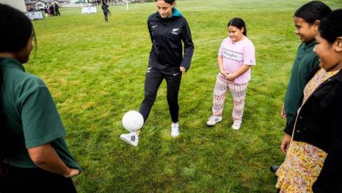足球运动员克劳迪娅·邦吉访问斯托克斯山谷的Tui Glen学校,在国际足联女足世界杯之前推广这项美丽的运动。