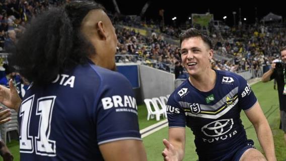 牛仔队的卢西亚诺·莱卢瓦和斯科特·德林克沃特在北昆士兰队创纪录地战胜老虎队后庆祝。