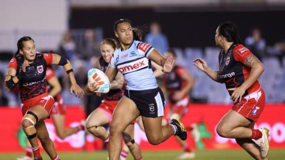 鲨鱼队的Annessa Biddle在两名新西兰蕨类队员Tyla nathanwong和Raecene McGregor之间奔跑,他们在NRLW为龙队效力。