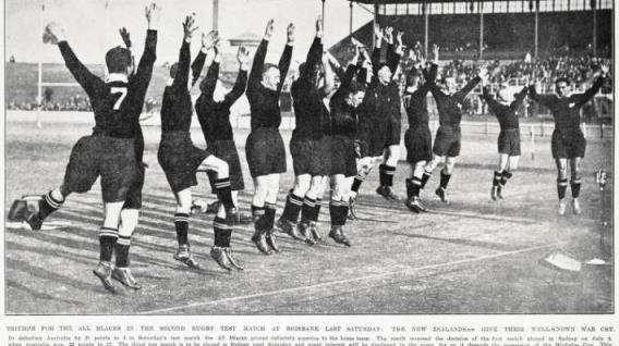 “最初的”全黑队在1905/1906年的不列颠群岛、法国和美国之旅中使用了哈卡舞。