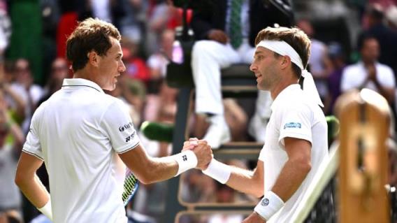 利亚姆·布罗迪(右)在温网意外获胜后与卡斯帕·鲁德握手。