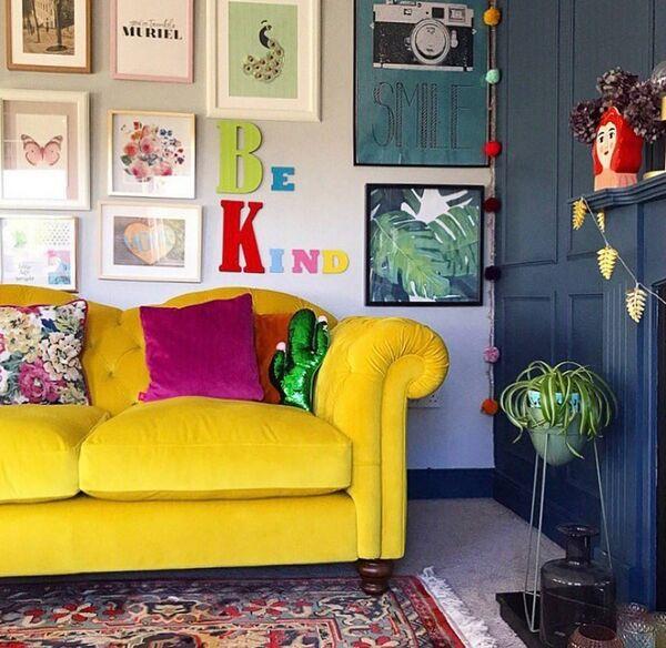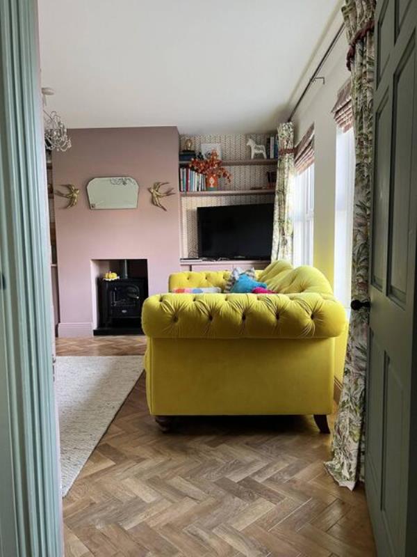 黄色是乔安妮最喜欢的颜色,她因为DFS设计的焦耳黄色天鹅绒切斯特菲尔德沙发而闻名。“我把它放在我的客厅里。我的家一年四季都像阳光一样,”她说。