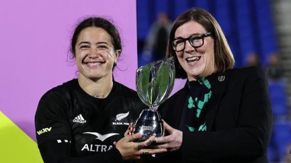周六晚上,黑蕨队边锋凯特琳·瓦哈科洛(Katelyn Vahaakolo)羞怯地走到领奖台前,她和队友们看着英格兰队在斯玛特山(Mt Smart)举起了首个WXV1奖杯。