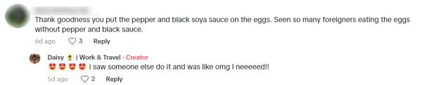 一位用户还称赞她在鸡蛋里加入了酱油和胡椒粉,并提到一些外国人通常不给煮半熟的鸡蛋调味。