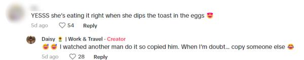 一位用户说:“她吃得很对。”对此,黛西提到她是从另一位顾客那里抄来的,他把烤面包蘸了鸡蛋。