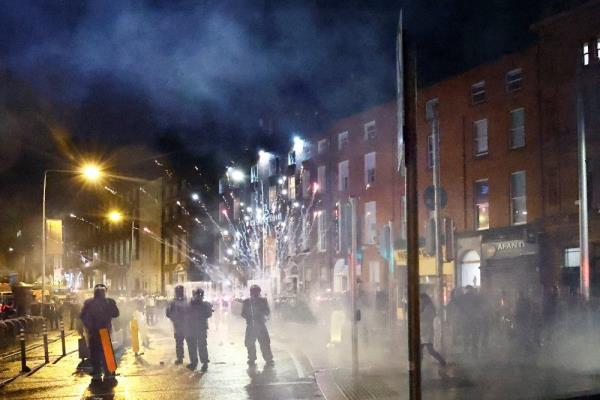爱尔兰,都柏林——11月24日星期五清晨,爱尔兰警察守卫着被抢劫的商店,消防员在都柏林市中心冷却燃烧的车辆。此前,三名幼童被刺伤,引发了一场在首都罕见的骚乱。