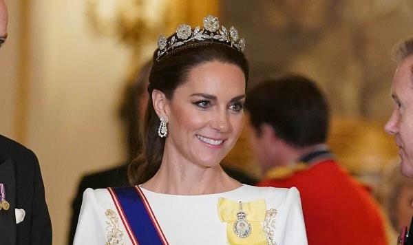 威尔士王妃在宴会上容光焕发,她戴着珍妮·帕克曼设计的白色婚纱头饰,戴着伊丽莎白二世曾经拥有的耳环,戴着女王的王室勋章,向已故女王致敬。